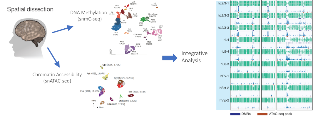 This project takes a team approach to generate single nuclei DNA cytosine methylation profiles (snmC-seq3, Ecker and Behrens labs) and chromatin accessibility maps (snATAC-seq, Ren and Behrens labs) of cells isolated from 41 anatomically defined regions of the human brain. This effort is a collaboration with the laboratory of Ed Lein (U01MH114812), who is developing single cell transcriptomic data from these same matched tissues, pooled from three donor brains. Upon completion, we will generate genomic mC DNA sequences from at least 110,700 neurons and 12,300 glial cells, as well as chromatin accessibility profiles from at least 410,000 brain cells. Multi-modal integration of these data sets with matched RNA transcriptomic data from the Lein group will identify consensus cell types and associated gene regulatory elements in these 41 tissue areas. Cell type-specific markers predicted through this bioinformatics analysis will be validated through RNA in situ hybridization and immunohistochemistry analysis. These efforts will support the future development of molecular tools to target specific human brain cell types, tools that will enhance the understanding normal brain function and support the discovery of targeted therapeutic approaches to treat human disease.