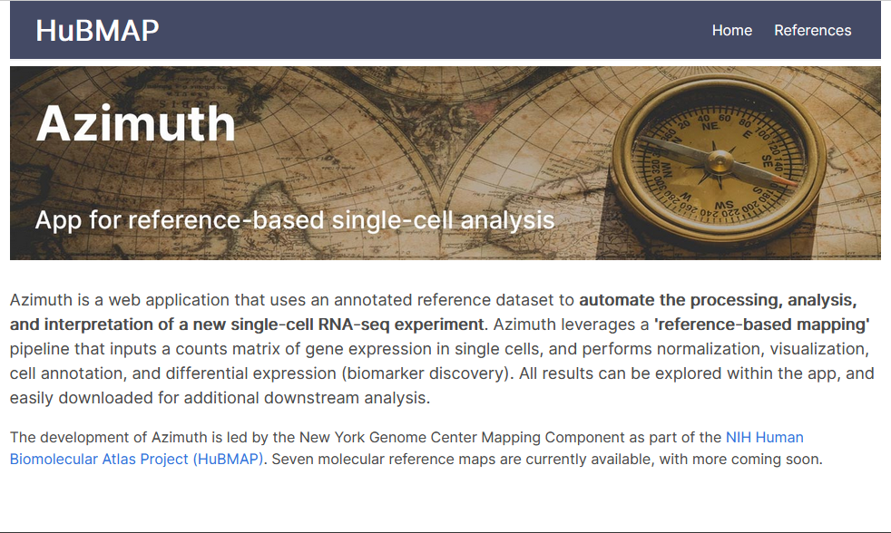 Azimuth (RRID:SCR_021084) is a web application that uses annotated reference dataset to automate processing, analysis, and interpretation of new single cell RNA-seq experiment. Azimuth leverages reference-based mapping, a pipeline that inputs a counts matrix of gene expression in single cells, and performs normalization, visualization, cell annotation, and differential expression. All results can be explored within the app, and easily downloaded for additional downstream analysis.