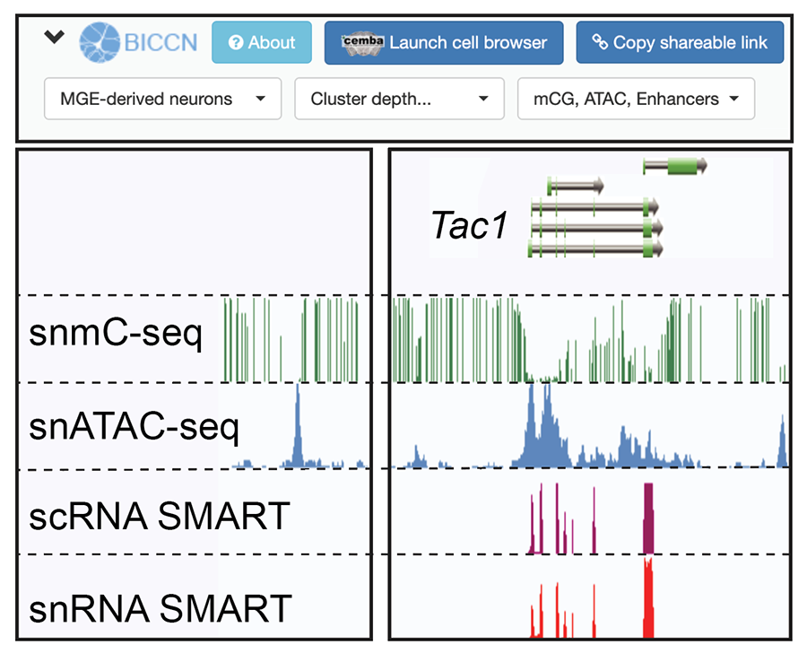 Brainome Portal (RRID:SCR_018162). Genome browser viewer for single cell epigenomic and transcriptomic data (DNA methylation, ATAC-seq, RNA-seq) from mouse primary motor cortex. Search for genes to visualize genomic loci, including enhancers marked by peaks of chromatin accessibility and low DNA methylation.
