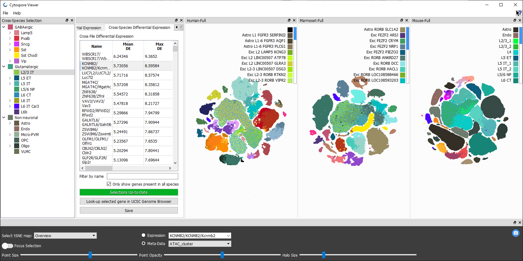 Cytosplore Viewer (RRID:SCR_018330) is an interactive visual analysis application (Windows and MacOS) for exploration of multi-species and cross-omics single cell data published in Allen Cell Types Database and for a growing number of single cell data resources of Brain Initiative Cell Census Network. Allows interactive exploration of cellular hierarchies, transcriptome wide gene expression and metadata of individual cells, and computation of differential statistics between cell selections or clusters, and across species. Integrates linkout to the UCSC genome browser for linked cross-omics, cross-species exploration between matched gene expression, chromatin state and DNA methylation data.