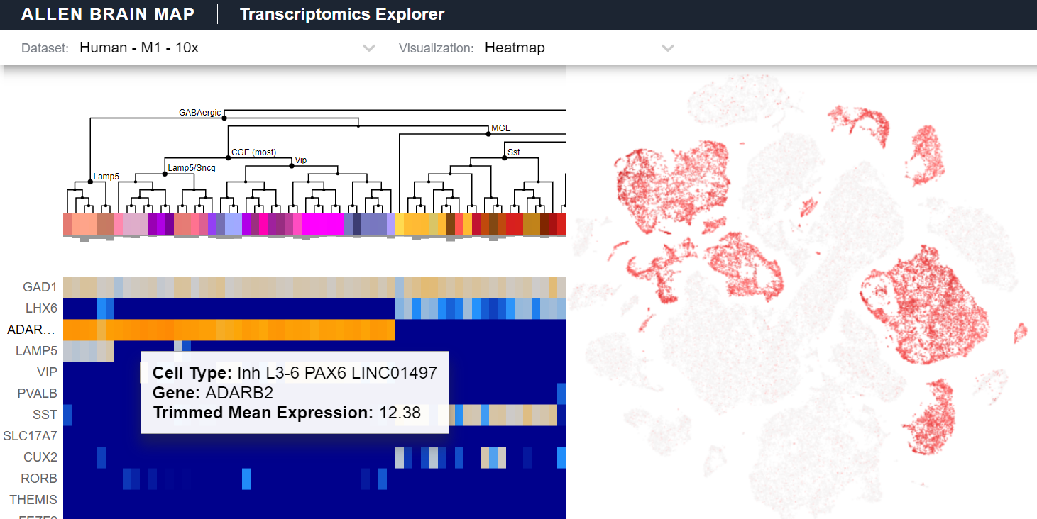 Transcriptomics Explorer (RRID:SCR_017567). Software tool to visualize and analyze transcriptomics data and transcriptomic cell types for mouse and human, all directly in the web browser. Explore gene expression across cell types, search for genes of interest, explore tSNE and UMAPs, and visualize a dataset’s sampling strategy to see how cells and nuclei were sampled across brain areas, cortical layer, and other dimensions. Used for Allen Cell Types Database to Browse Data: Human - Multiple Cortical Areas and Mouse - Cortex and Hippocampus, as well as other datasets.